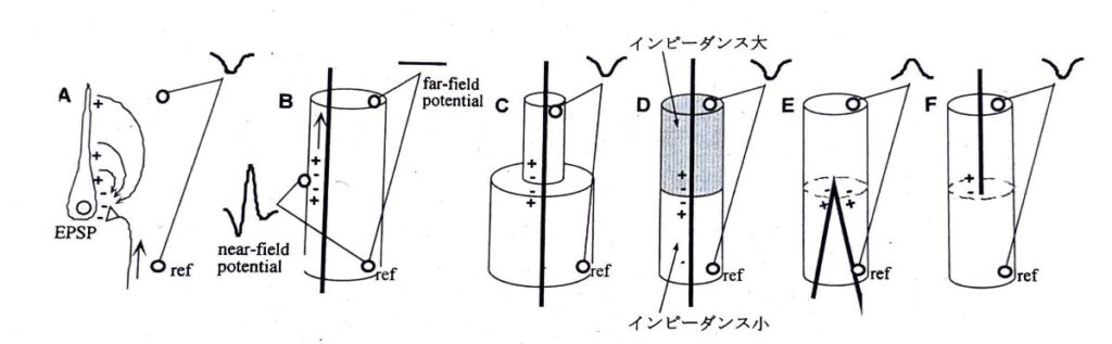 活動電位は、方向が反対でモーメントが等しい2つの電流双極子と考えられる。この2つの双極子によって生じる電位は、十分遠方に置かれた電極ではお互いに打ち消し合ってゼロ電位になるため、通常はFFPは全く記録されない(図B)。一方で探査電極を活動電位近傍に置けば、陽性→陰性→陽性の三相性NFPが記録される(図B)。