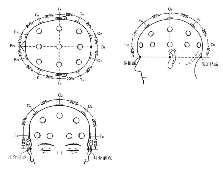 Cz:鼻根(両目の間の鼻の付け根の凹んだ部分)と後頭結節(後頭部の1番突出している部分)の中点