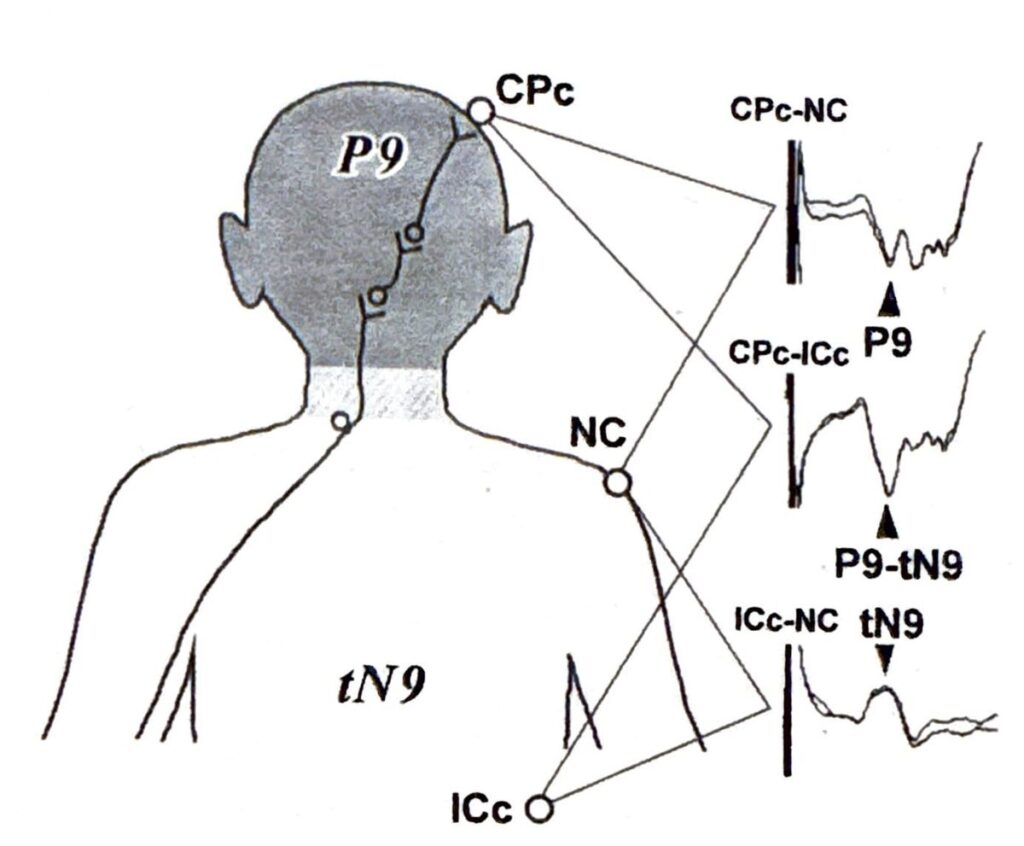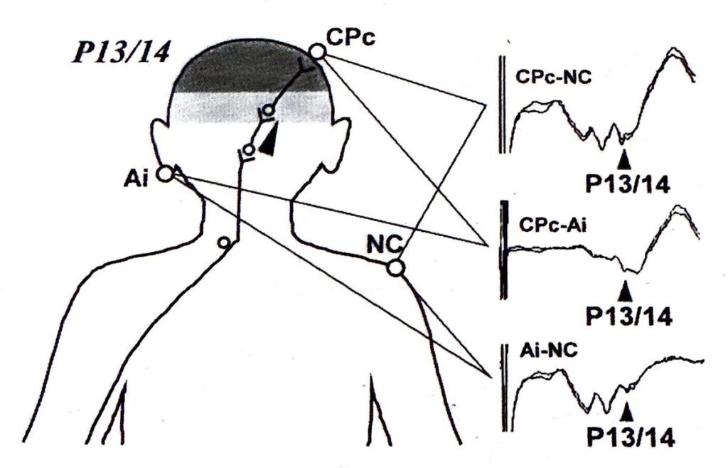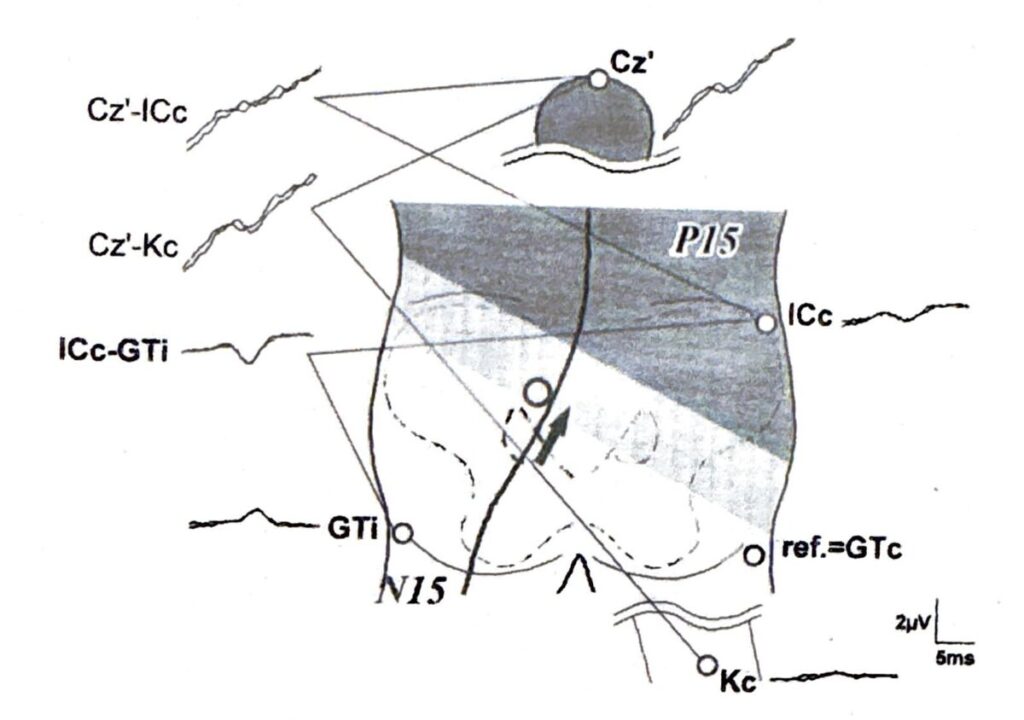内側毛帯の伝導開始に伴うjunctional potentialと考えられている。脳幹下部高位を境界として、頭側に陽性電位、尾側に陰性電位が分布するため、頭皮上電極は陽性コンパートメント、刺激対側肩は陰性コンパートメントに位置している。耳朶は境界線上に位置している。
