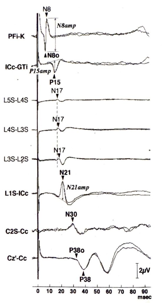 全ての脳表電極では、P13/14に引き続いて陰性電位が記録されて皮質成分が始まるが、その影響が少ないCPi電極では持続時間約20msecを超えるN18がみられる。CPi-C2Sで評価しやすい。延髄下部高位を起源とする。
