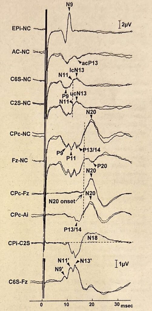 後頚部電極と非頭部基準電極を結んだC6S-NC・C2S-NCでは、P9に続いてN11・N13が記録される。N11は後索の上行性電位のNFPである。C6Sで記録されるlcN13は前頚部(AC)で記録されるacP13と対をなすもので、正中神経の脊髄entryレベルで後角神経細胞に生じたシナプス後電位由来と考えられている。C2Sで記録されるucN13は楔状束核に生じるシナプス後電位由来と考えられている。