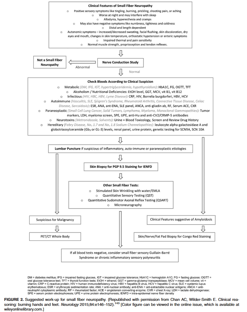 - 小径線維の障害を示唆する臨床徴候(チクチク感+温冷覚障害±アロディニア±痛覚過敏)