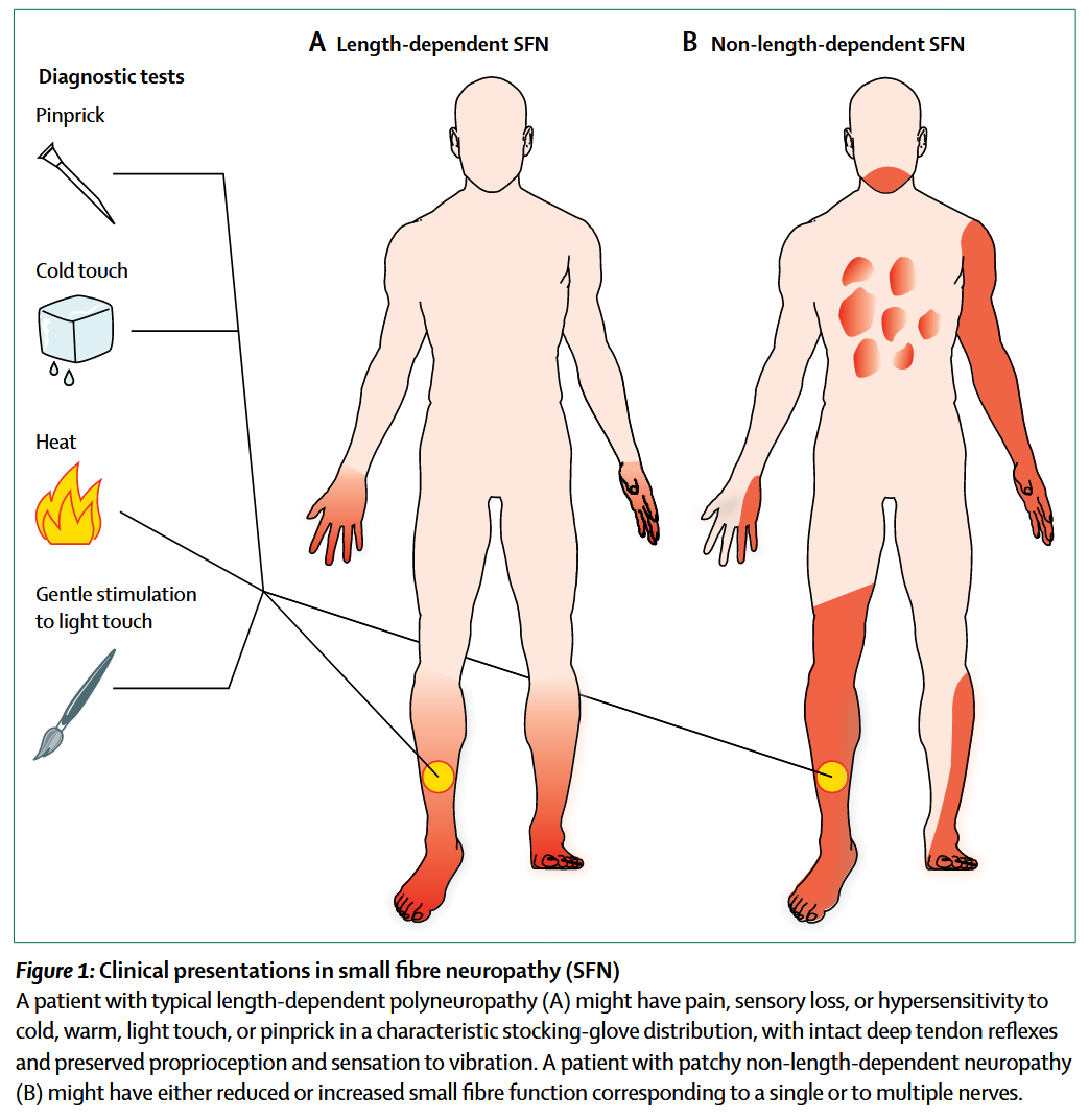 末梢神経障害は基本的には大径線維・小径線維のいずれもが障害されるが、SFNではAδ線維(有髄)・C線維(無髄)が選択的に障害される。そのため表在感覚異常(疼痛)と自律神経障害が主症状となる。
